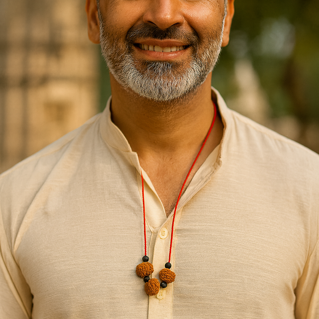 This Karya Siddhi Rudraksha Yantra is a powerful spiritual combination of 3 Rudraksha beads – 7 Mukhi, 8 Mukhi, and 7 Mukhi. Strung in a sacred red thread, this yantra is designed to be worn around the neck by both men and women.
